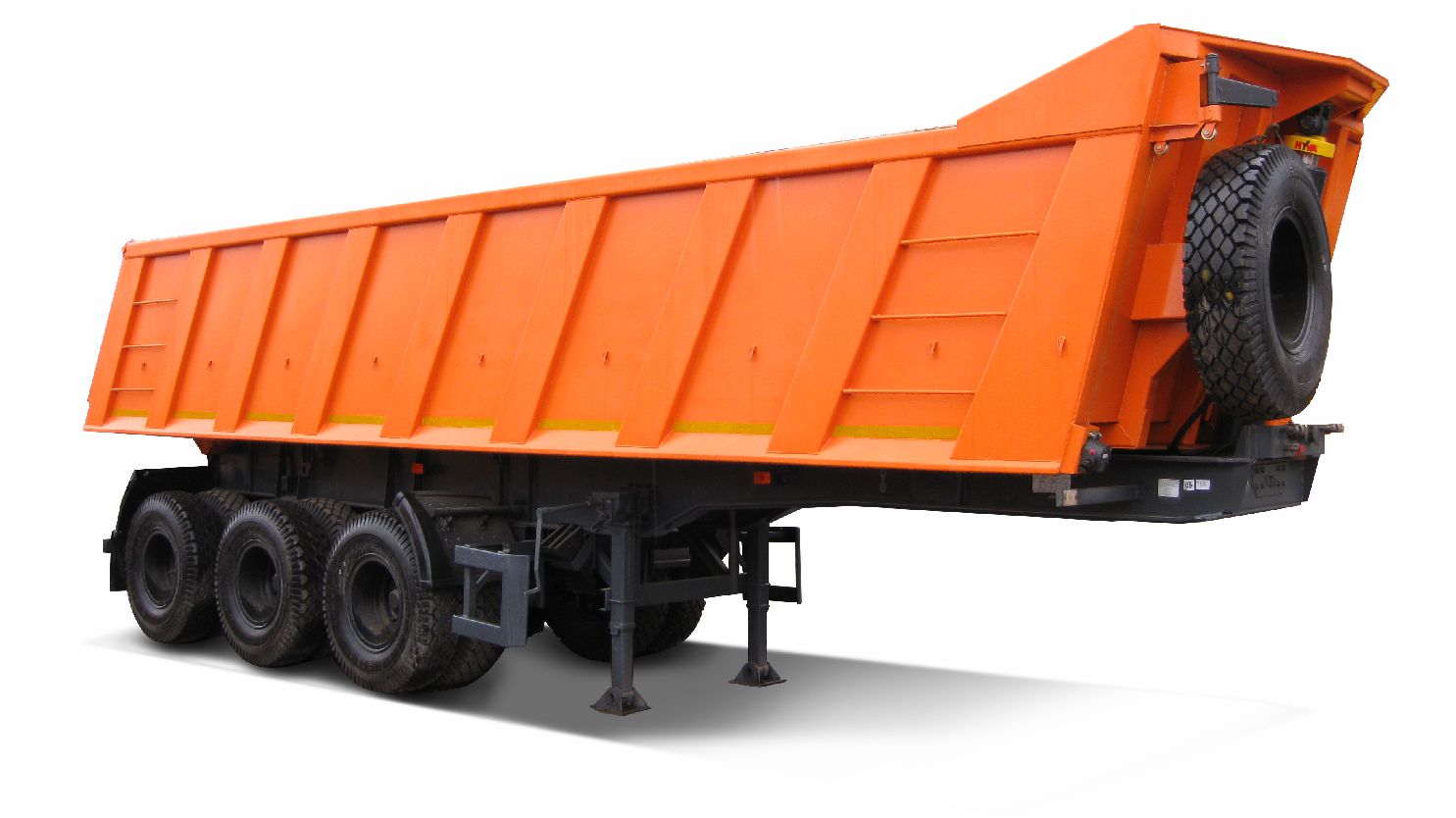 • The dump semi-trailer operates with a hydraulic system for unidirectional rear unloading at a lifting angle of 52°, controlled from the cabin.